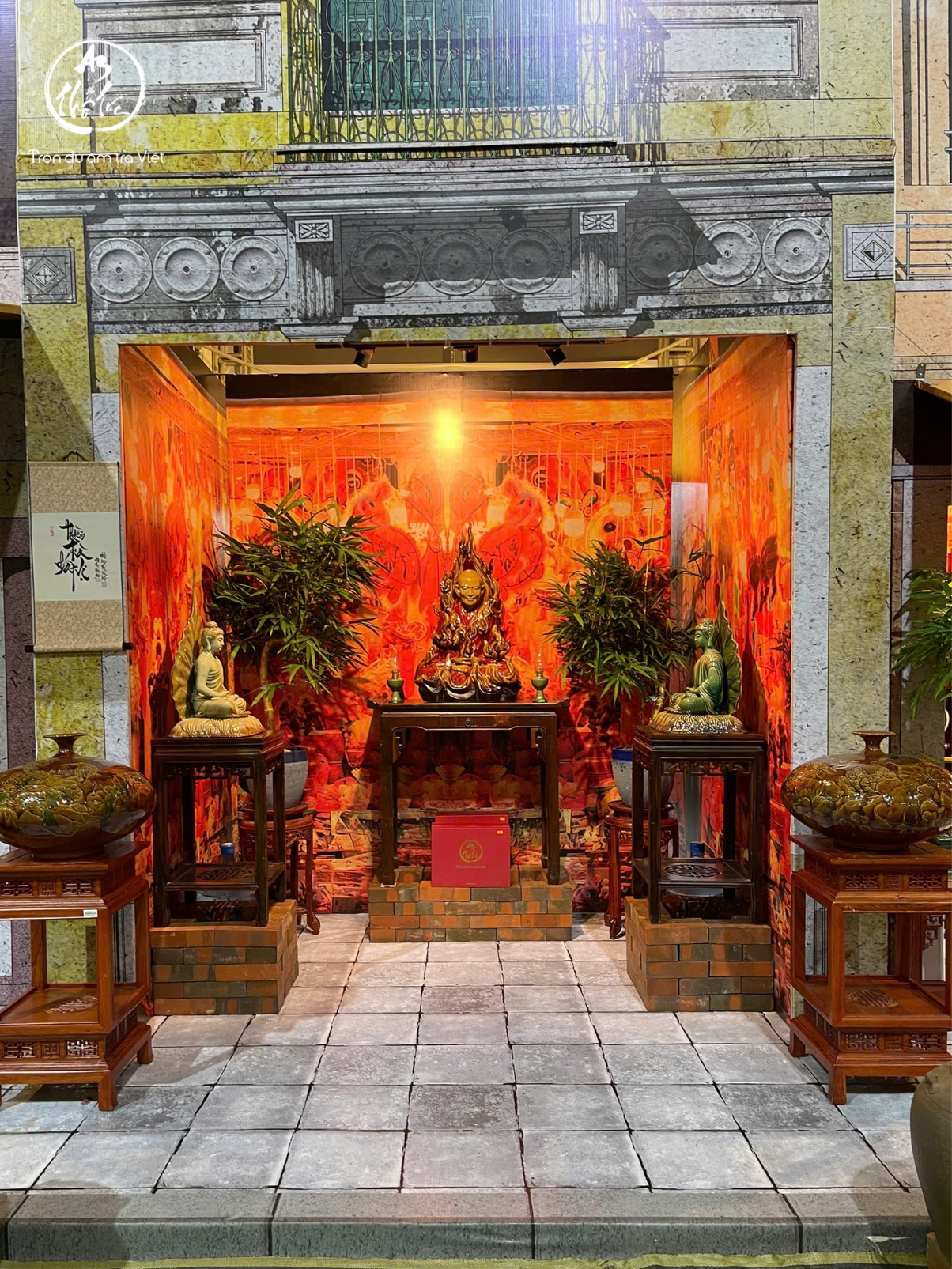 Bên trong mỗi ô nhà là những không gian được dựng dựng công phu: tượng thờ, bình gốm, kệ gỗ, chum cũ, bonsai xanh, ánh đèn vàng cam phủ lên nền tường đỏ mang tinh thần hoài cổ, khiến từng góc nhỏ đều trở nên dày lớp ký ức. Những chiếc ấm, chén và bộ trà cụ tinh xảo không chỉ được bày biện như sản phẩm, mà như một phần của đời sống, như thể đã có người dùng, đã từng có hơi trà, có cuộc đối thoại diễn ra ở đó.