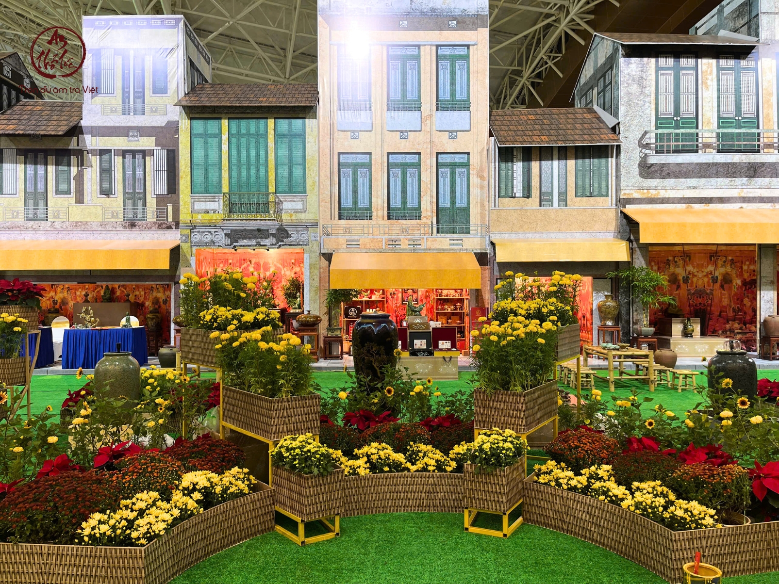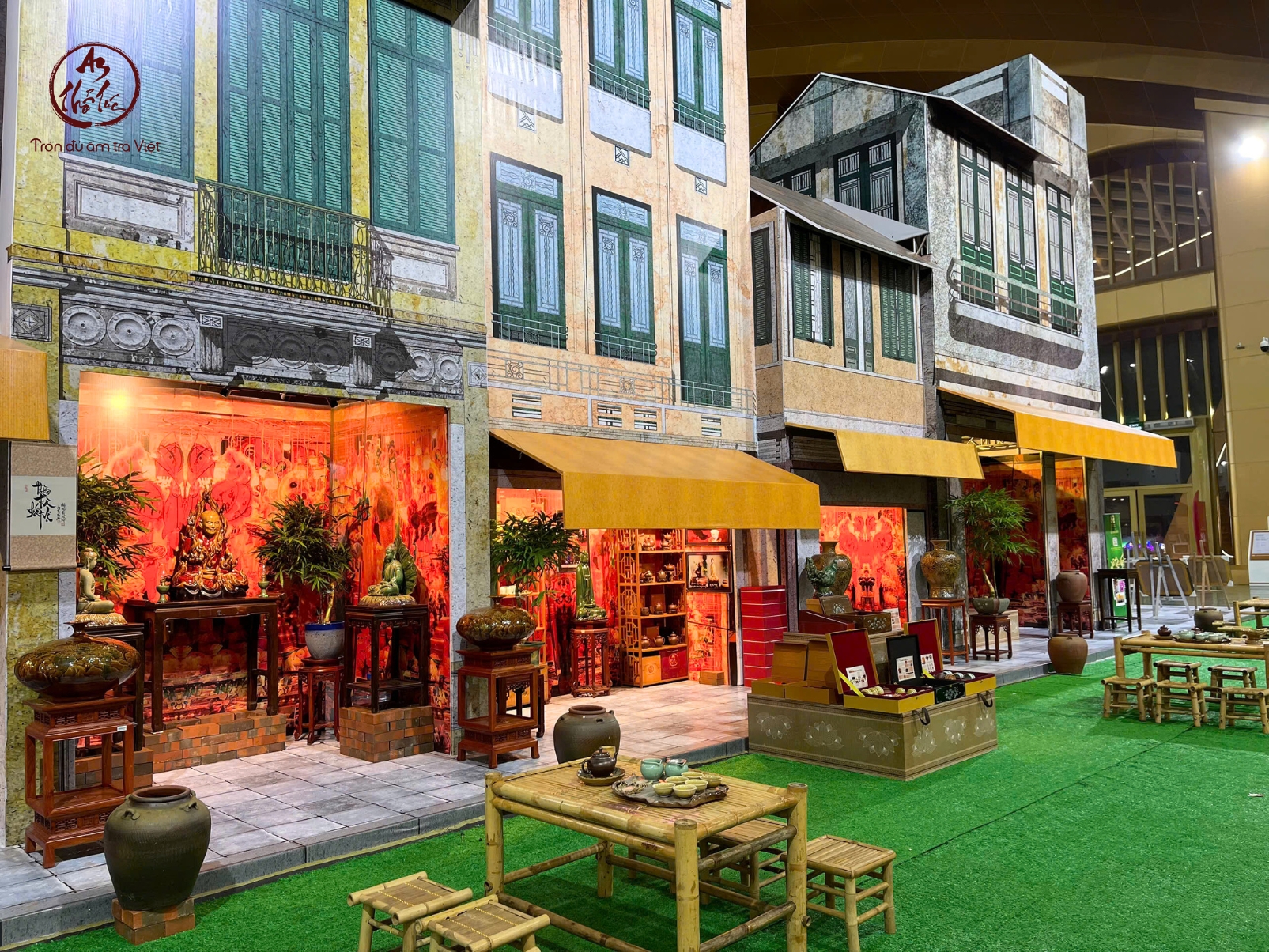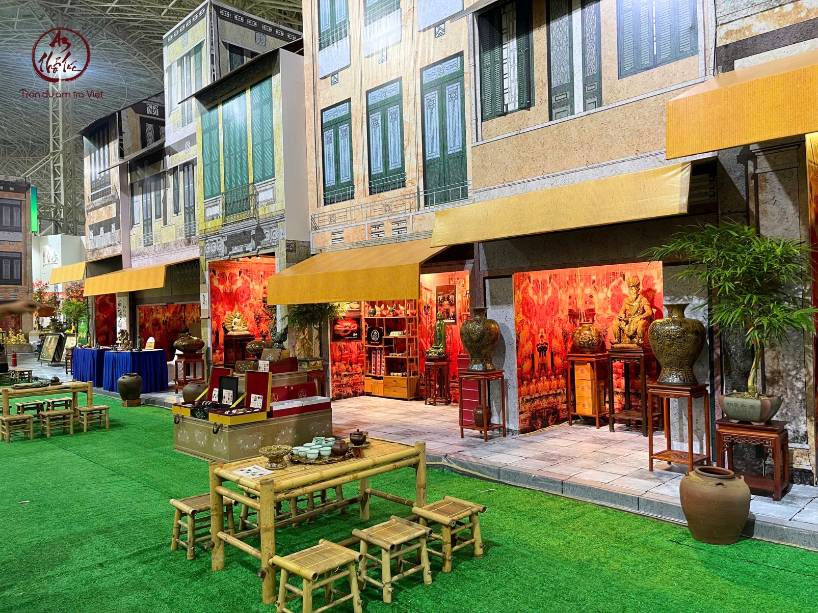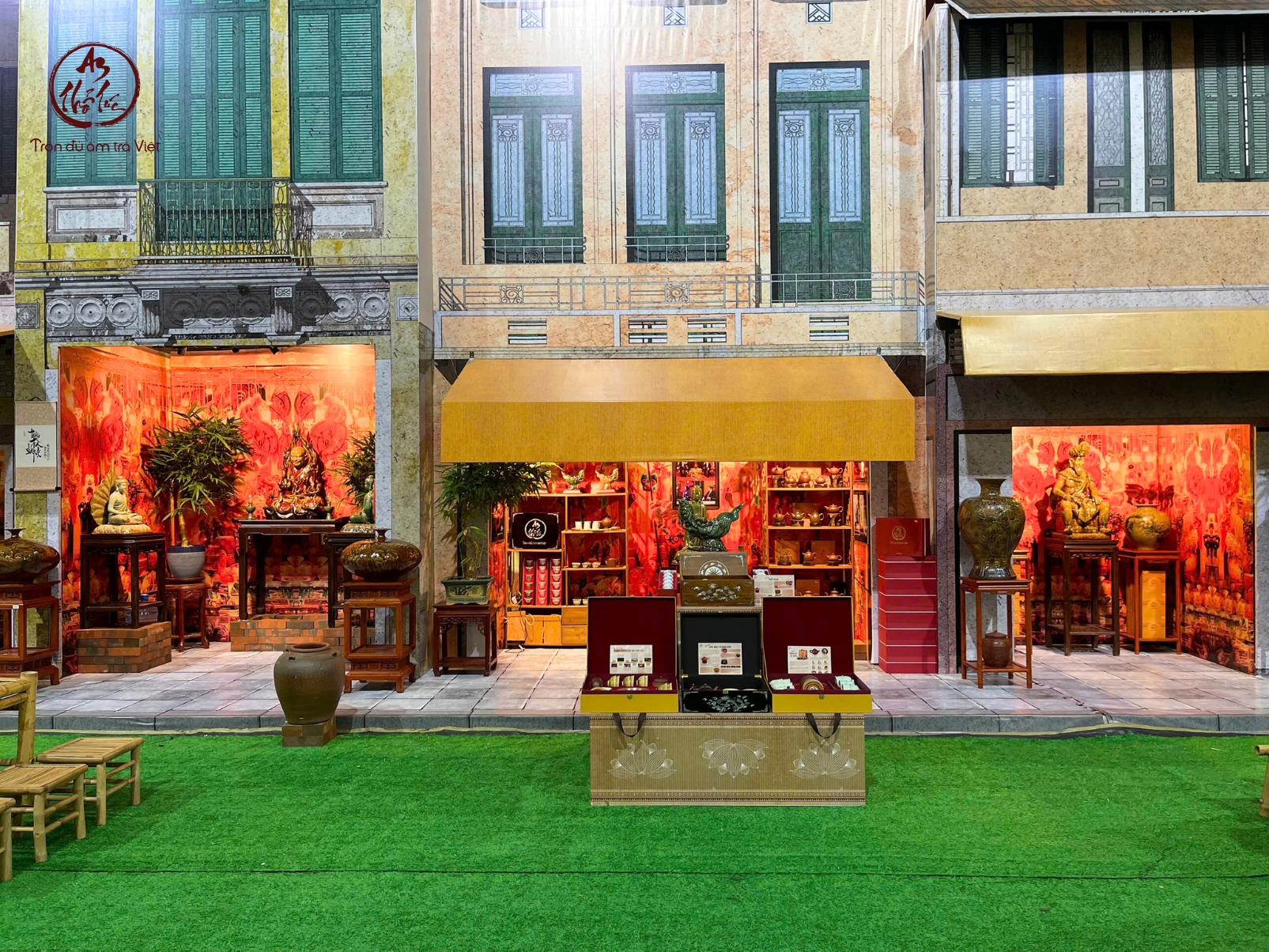 An Thổ Túc chọn cách kể chuyện không bằng lời nói mà bằng không gian. Ngay từ khi bước chân tới khu trưng bày tại Sảnh 8, người xem sẽ bắt gặp một lát cắt Hà Nội cổ được “đặt lại” giữa lòng hội chợ hiện đại: những dãy nhà mặt phố với mái hiên vàng như ngậm nắng thu, những khung cửa sổ xanh rêu phảng phất phong vị Đông Dương, và phía trước là khoảng sân lát gạch xưa, nơi bàn tre và ghế tre đã được xếp ngay ngắn như chờ một cuộc trà đàm sắp diễn ra.