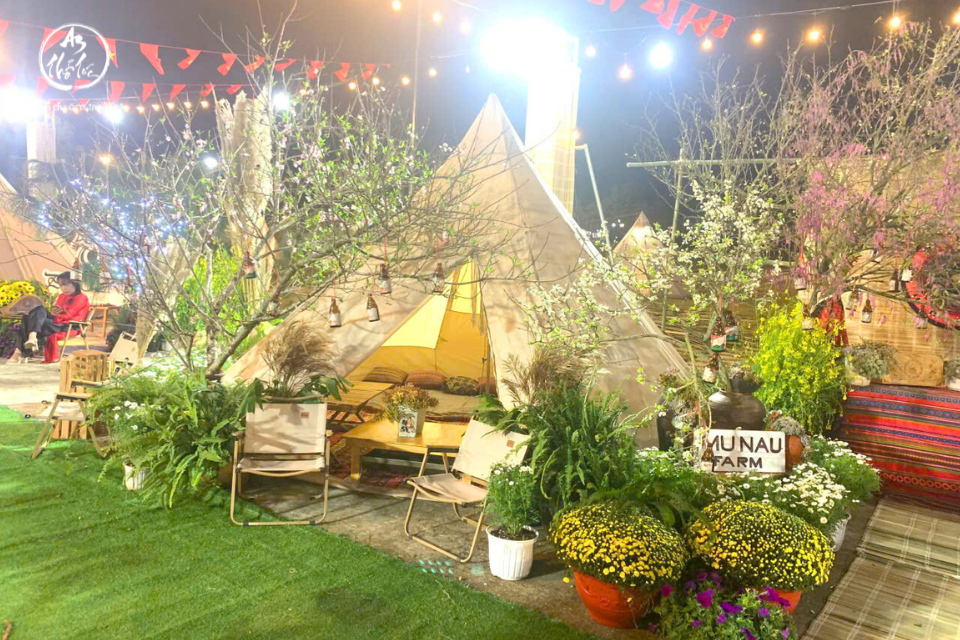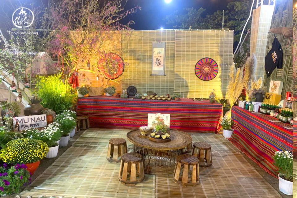 Giữa khung cảnh ấy, không gian trà của An Thổ Túc hiện diện lặng lẽ mà mộc mạc. Không tách mình khỏi lễ hội, cũng không hòa tan vào sự náo nhiệt, bàn trà được đặt yên trên nền tre, ánh đèn vàng dịu soi lên gốm mộc, bếp lửa nhỏ giữ hơi ấm. Những chén trà tỏa hương nhẹ, đủ để níu bước chân của du khách trong và ngoài nước.