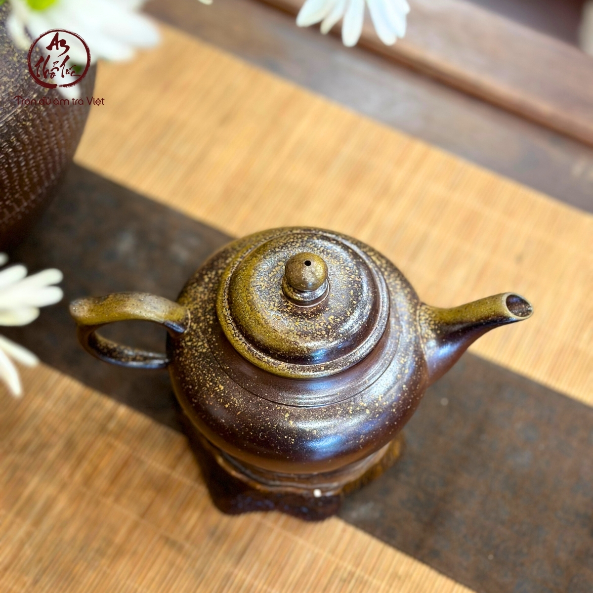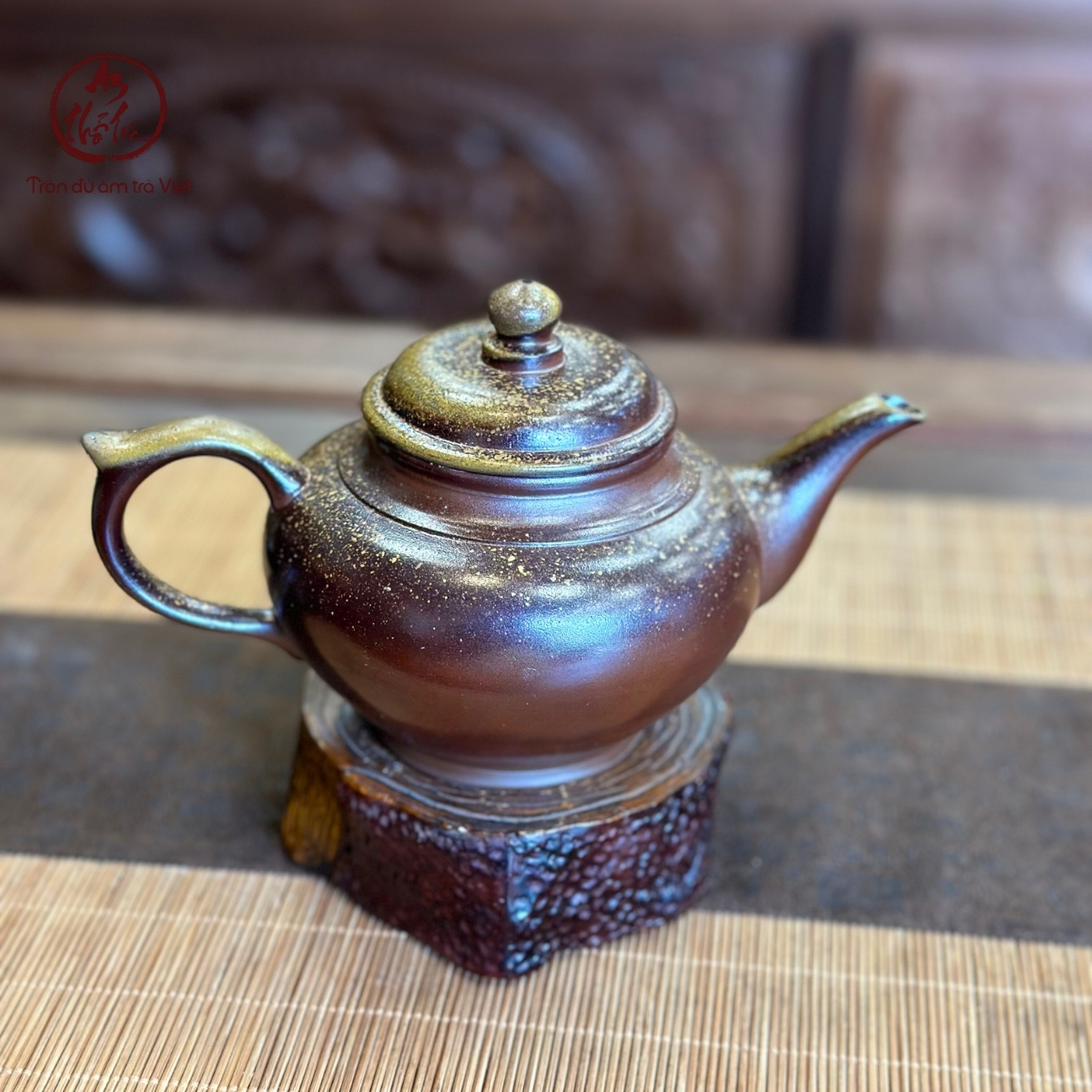 Trong khoảnh khắc lửa đạt đỉnh nhiệt, tro củi li ti bay theo gió lò, bám lên bề mặt ấm đang đỏ rực. Ở nhiệt độ 1.200–1.250°C, tro nóng chảy, kết hợp với silica trong đất để tạo nên lớp men tro tự nhiên – thứ men không thể lặp lại ở bất kỳ chiếc ấm nào khác. Tùy vị trí đặt trong lò và loại củi sử dụng, mỗi chiếc ấm sẽ mang một diện mạo độc bản: hiệu ứng muối tiêu mịn, ánh kim dịu, vệt chảy nhẹ, hay sắc nâu trầm mộc mạc.