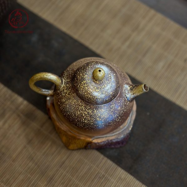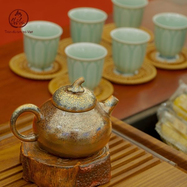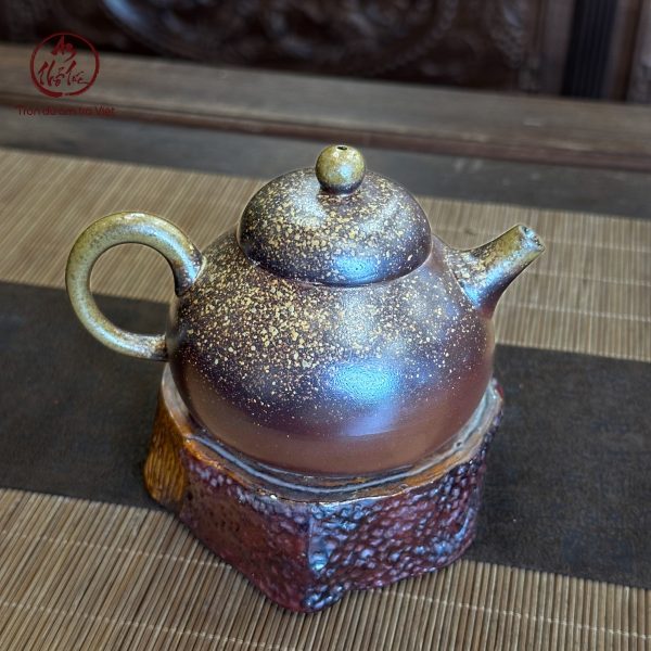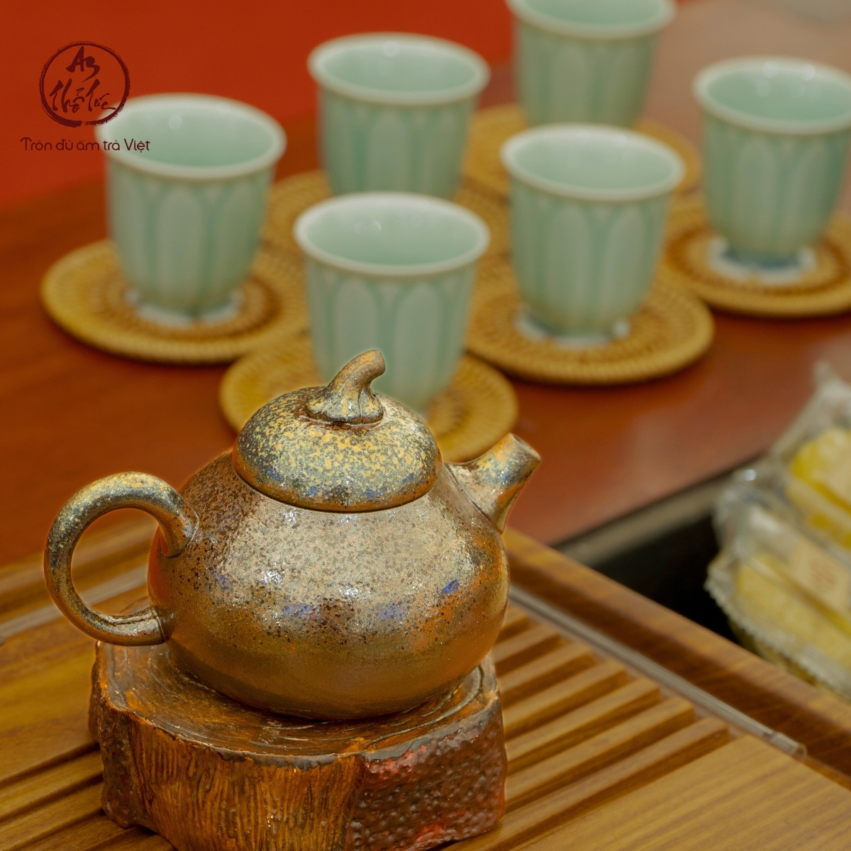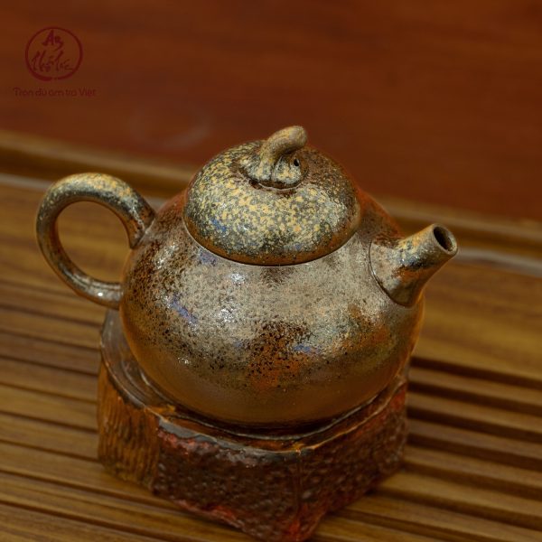 Trong khoảnh khắc lửa đạt đỉnh nhiệt, tro củi li ti bay theo gió lò, bám lên bề mặt ấm đang đỏ rực. Ở nhiệt độ 1.200–1.250°C, tro nóng chảy, kết hợp với silica trong đất để tạo nên lớp men tro tự nhiên – thứ men không thể lặp lại ở bất kỳ chiếc ấm nào khác. Tùy vị trí đặt trong lò và loại củi sử dụng, mỗi chiếc ấm sẽ mang một diện mạo độc bản: hiệu ứng muối tiêu mịn, ánh kim dịu, vệt chảy nhẹ, hay sắc nâu trầm mộc mạc.