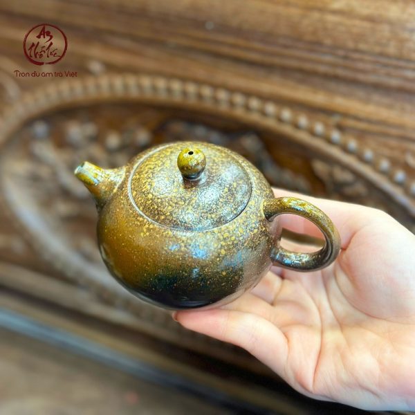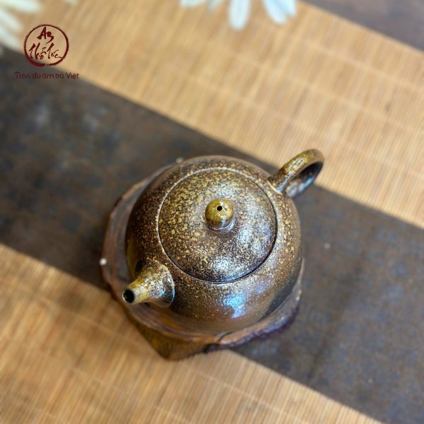 Trong khoảnh khắc lửa đạt đỉnh nhiệt, tro củi li ti bay theo gió lò, bám lên bề mặt ấm đang đỏ rực. Ở nhiệt độ 1.200–1.250°C, tro nóng chảy, kết hợp với silica trong đất để tạo nên lớp men tro tự nhiên – thứ men không thể lặp lại ở bất kỳ chiếc ấm nào khác. Tùy vị trí đặt trong lò và loại củi sử dụng, mỗi chiếc ấm sẽ mang một diện mạo độc bản: hiệu ứng muối tiêu mịn, ánh kim dịu, vệt chảy nhẹ, hay sắc nâu trầm mộc mạc.