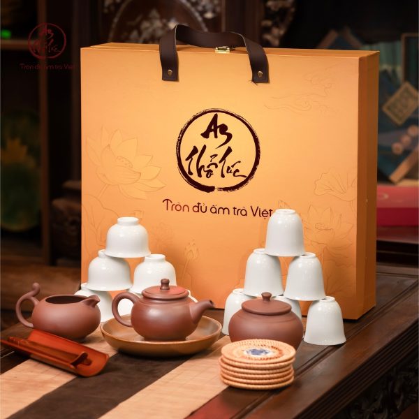 Bộ trà cụ Tròn Đủ 25 món là lựa chọn sang trọng và đầy đủ cho những buổi trà đàm đông người. Bộ quà tặng bao gồm 01 chiếc ấm Dáng Mới với dung tích 280ml được chế tác thủ công từ bài đất quý An Thổ Túc sau gần mười năm nghiên cứu, cải tiến, bổ sung các thành phần tự nhiên và phân tích khoa học. Sau đó được nghiền nhỏ liên tục 72 giờ và nung trên 1200°C cho xương đất cứng chắc, giữ nhiệt tốt, giúp trà lên hương và giữ trọn vị.