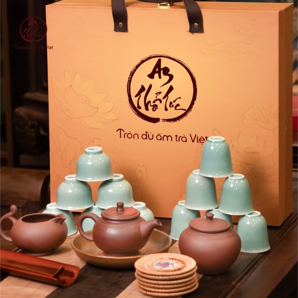 Đi kèm trong bộ quà tặng là 12 chén trà trong đó có 06 chén dáng cao, lòng sâu phù hợp uống trà vào mùa Đông – Xuân và 06 chén dáng thấp phù hợp để thưởng trà vào mùa Hạ – Thu. Đặc biệt, các loại chén sứ của An Thổ Túc được làm từ nhiều dòng men như: men ngọc, men tro, men hoàng lưu ly,….